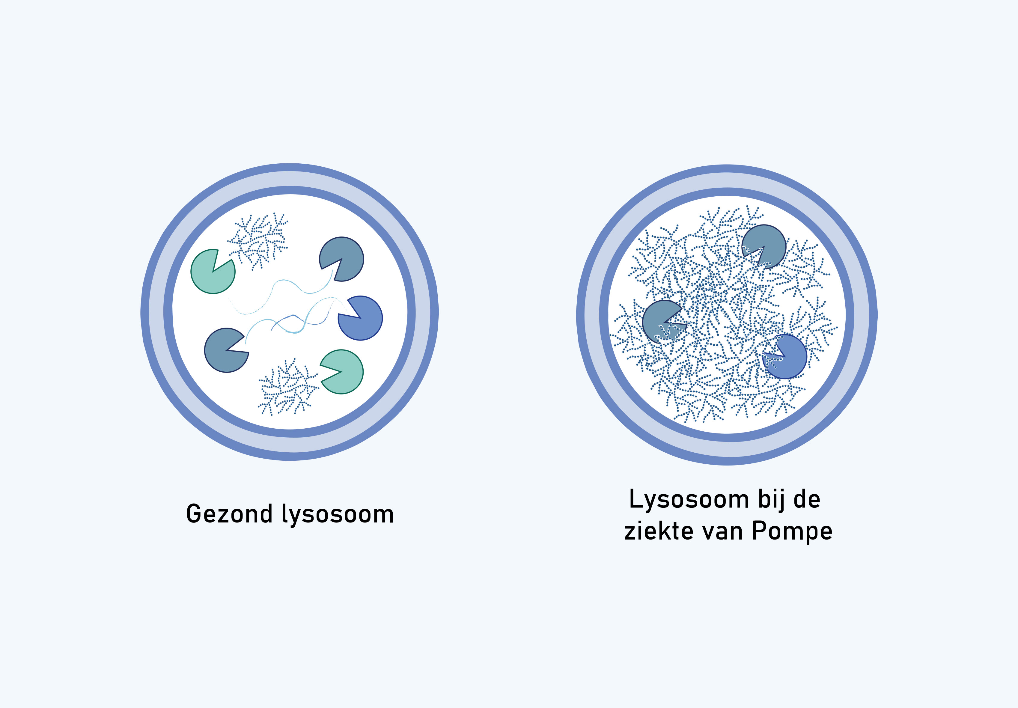In Pompe disease, the lysosomal enzyme GAA does not function properly. As a result, glycogen (a large sugar molecule) is not broken down efficiently and accumulates in organs and tissues. The primary tissue affected by this buildup is muscle tissue. In the most severe form of the disease, the heart and brain are also affected.