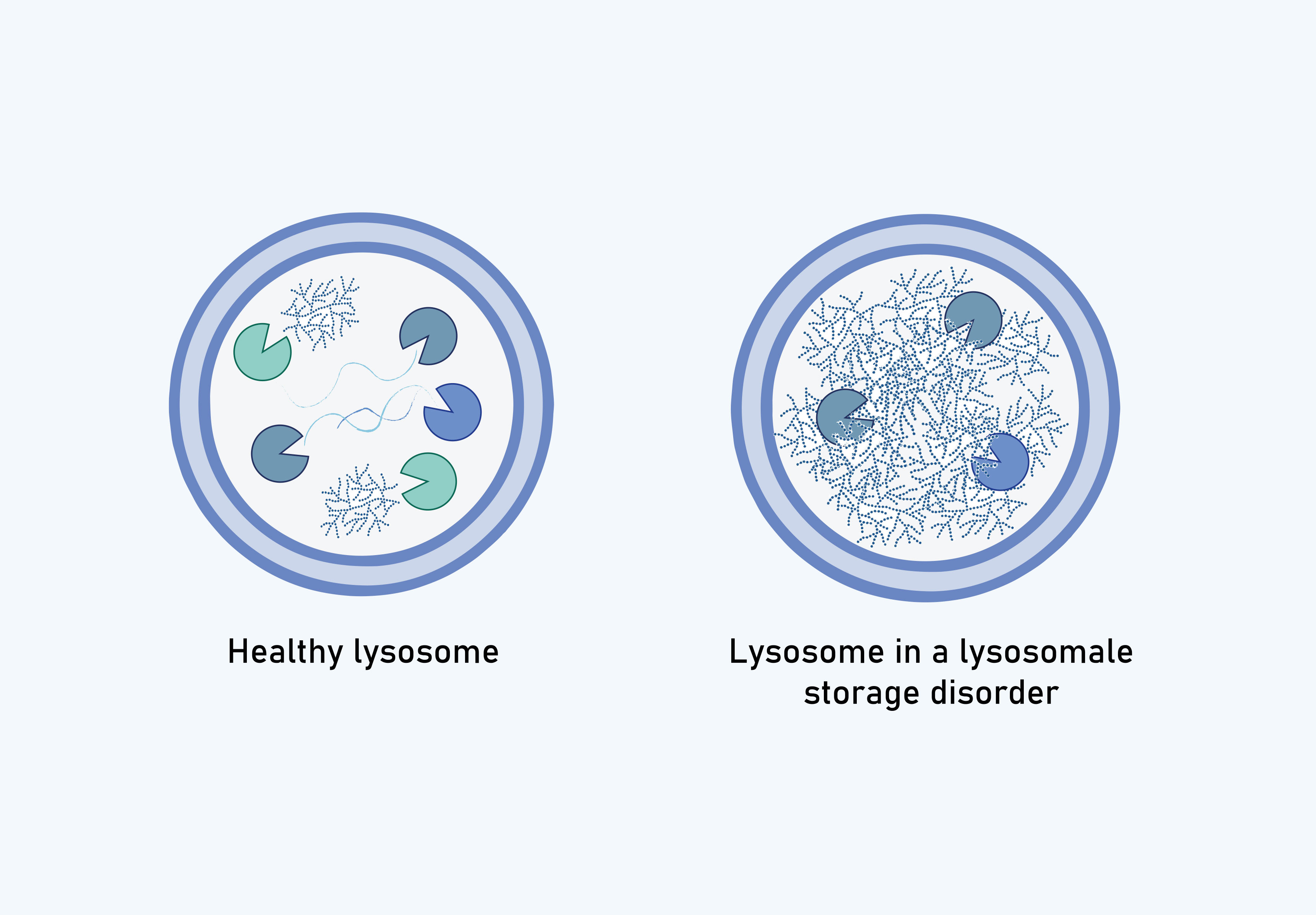 In lysosomal storage disorders, the lysosome does not function properly due to the absence or malfunction of a specific protein: an enzyme. A lysosome acts as the cell’s waste disposal and recycling center. Much like a city has facilities that break down waste and recycle useful materials, lysosomes help clean up and recycle waste within a cell. The specialized proteins inside lysosomes—the enzymes—are responsible for breaking down cellular waste. When an enzyme is missing or defective, the lysosome cannot do its job properly. As a result, waste products accumulate inside the cell and can cause damage to various organs in the human body. This is what happens in lysosomal storage disorders.
